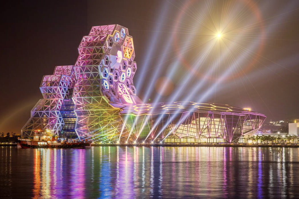 音樂中心高流建築群包括海風廣場、音浪塔(室內大型表演場館)、鯨魚堤岸(6間小型展演空間)